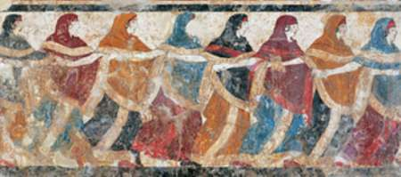 Luego llega el periodo que va desde el siglo V hasta mediados del IV a.C., el cual es conocido como “el de la elegancia nacional”, en el que destacan los trabajos de artistas conocidos, como Polignoto (Πολύγνωτος), hijo de Agalofon, y que está considerado como el primer pintor de la Antigüedad. Nacido en Tasos, vivió casi toda su vida en Atenas, pintando en esta ciudad cuadros, todos murales, como “La toma de Troya”, en las paredes de la Stoa Pecile (Pórtico de Pisianacte, un monumento erigido en un enclave privilegiado al norte de la Ágora de Atenas), o el fresco en honor de la bodas de las hijas de Leucipo de Mileto, en el Anaceo, o el de “La batalla de Maratón”, en el pórtico de Atenas; sin embargo, su pintura más importante fueron los frescos en la galería del palacio de Delfos, cuyo tema era la visita de Hades por Odiseo y la toma de Troya de la cual solamente nos queda constancia escrita; empleaba pocos colores y bastante simples, siendo su arte bastante primitivo, de un simpleza casi infantil, pero poseyendo sus dibujos una extraña belleza, sobre todo en las figuras individuales, destacando su realismo, como en su famoso “asno”, la “liebre” o las mujeres con velos transparentes, aunque no es el caso de este grupo de bailarinas entrelazadas con sus manos y cuyos trajes tienen profusión de colores