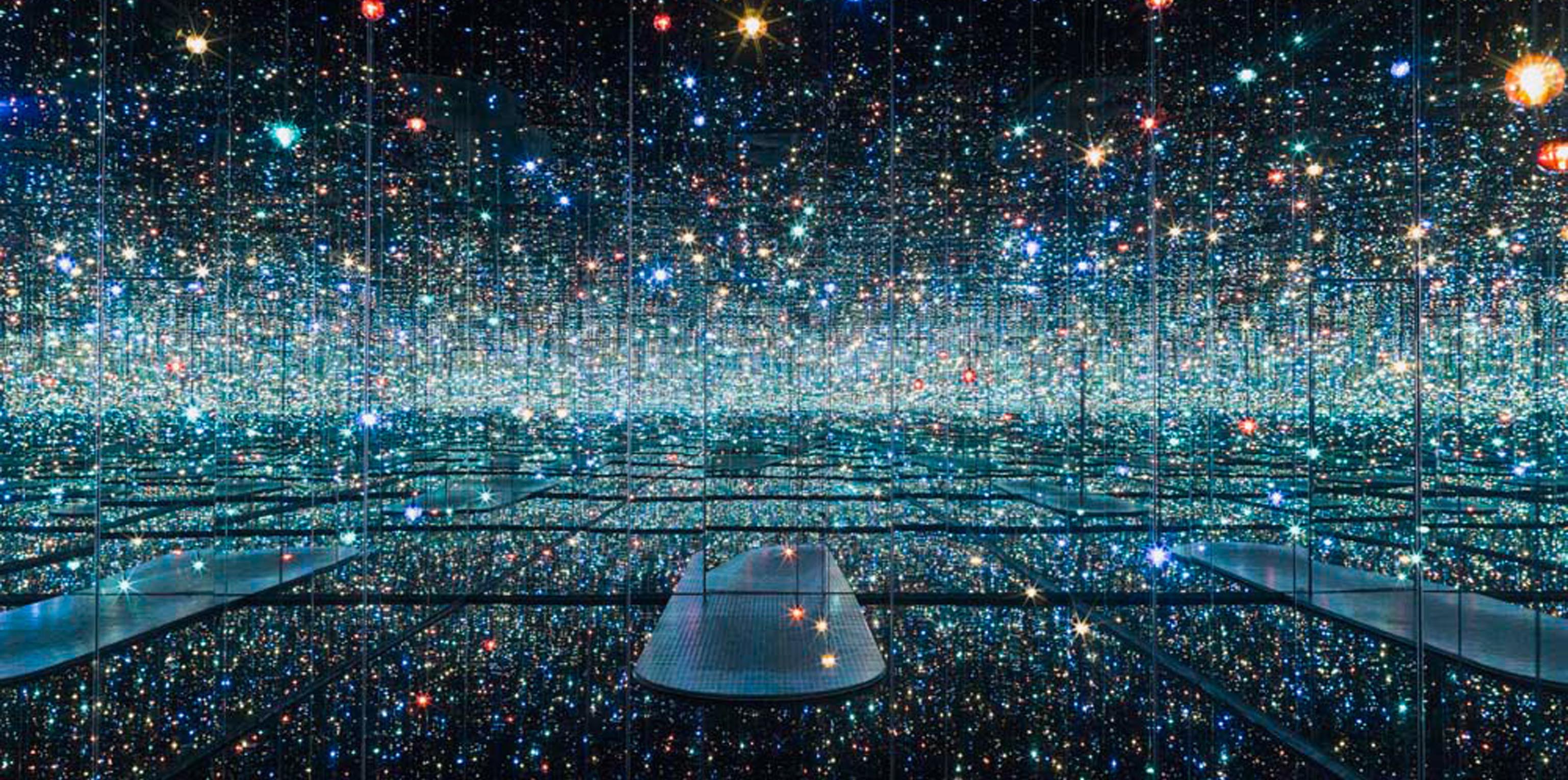 Kusama comenzó su serie Infinity Mirror Room en la década de 1960, y hasta ahora ha creado más de veinte habitaciones distintas. Cada habitación Infinity Mirror consiste en un espacio oscuro similar a una cámara completamente forrada con espejos y llena de diversos objetos: calabazas, falos, linternas… Esta habitación en particular consta de pequeñas luces LED colgadas del techo y parpadeando en un patrón rítmico creando lunares electrónicos pulsantes. Las luces se reflejan en los espejos creando la ilusión de un espacio infinito. Solo un visitante a la vez puede experimentar la instalación con ese visitante singular convirtiéndose en parte integral de la obra, ya que su cuerpo activa el entorno una vez en la habitación. Este espacio tranquilo y meditativo es una reflexión sobre la vida y la inevitabilidad de la muerte, temas que han fascinado a Kusama desde que era pequeña.