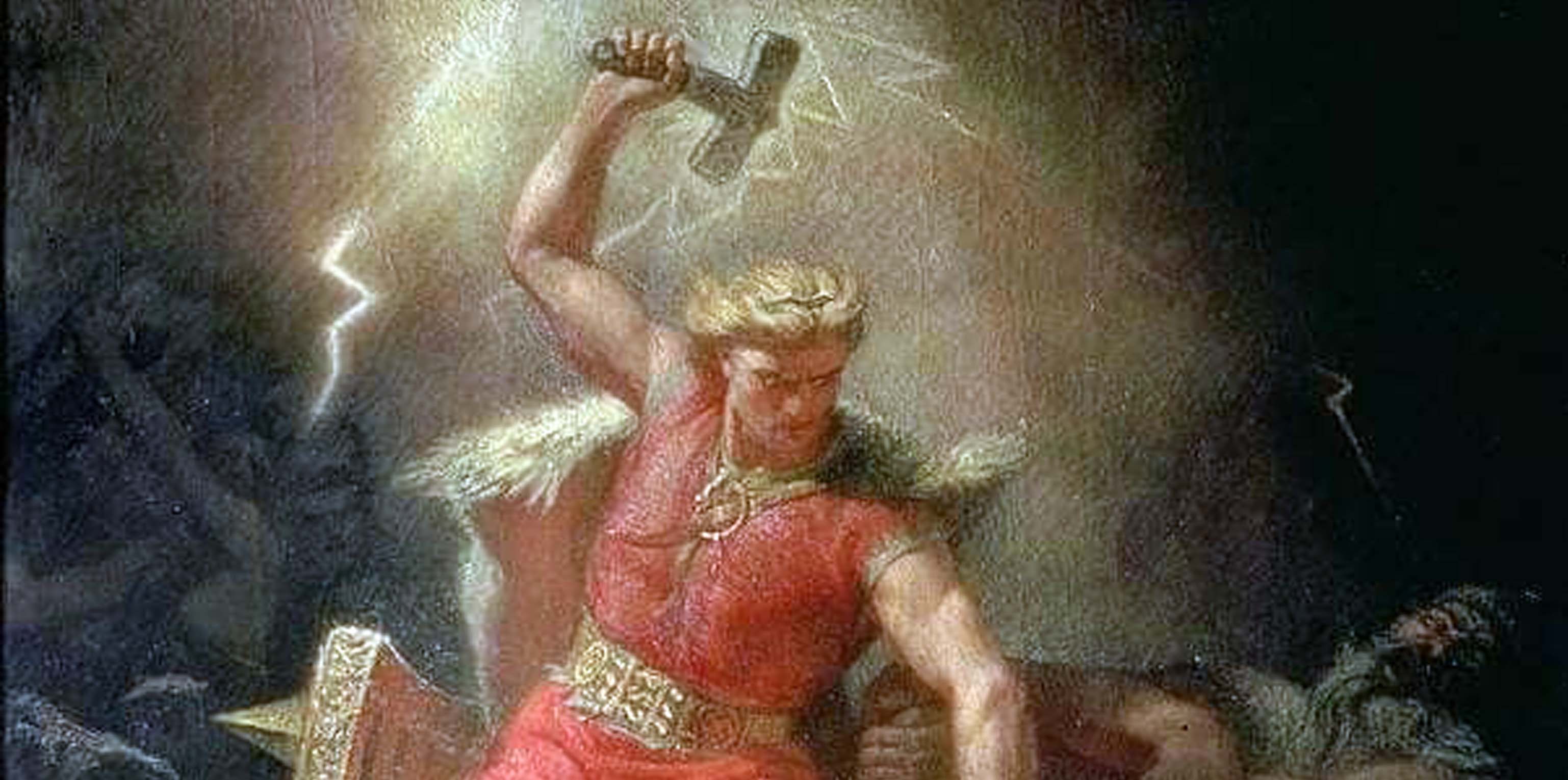 El autor quiso reflejar todo el simbolismo que se desprende del antiguo mito colocando a Mjölnir, el martillo de Thor, como el elemento central del mito y la pintura. En la mitología nórdica, como ya he explicado más arriba, es un arma de destrucción contra los gigantes, un símbolo de protección y un objeto ritual para bendiciones. Winge lo representa como un objeto luminoso y descomunal, enfatizando su poder divino. Al mismo tiempo, la acción de Thor levantando Mjölnir evoca relatos como los de la Edda Poética, donde usa el martillo para derrotar gigantes, como en su enfrentamiento con Hrungnir o en el mito del robo de Mjölnir (aunque este último no es la escena exacta).